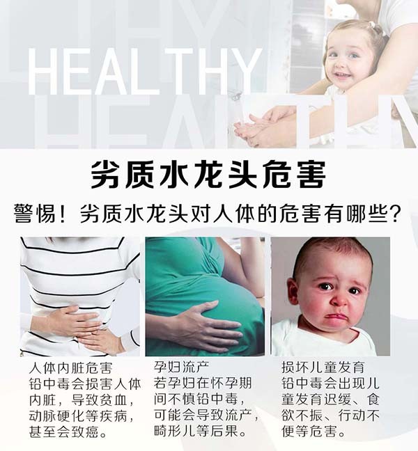 劣质水龙头多数含铅超标,对饮用水造成二次污染,吸收进入人体会产生巨大危害。
