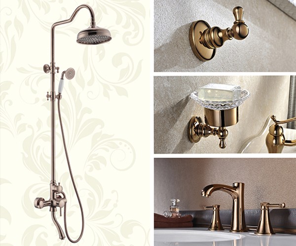 将潮流的玫瑰金色与挂件、龙头、雨林结合,简洁精湛的设计,迷人的金属光泽,浴室顿时散发低调奢华气质。
