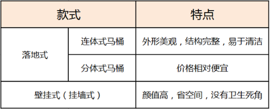 不同款式的马桶有各自的优势特点,大家可以按照自家的实际情况来选择。需要注意的是,壁挂式马桶要在墙内预埋水箱,一旦水箱出现问题,维修相对要麻烦些。
