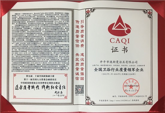 澳斯曼卫浴获“全国卫浴行业质量领军企业”及“全国产品和服务质量诚信示范企业”荣誉