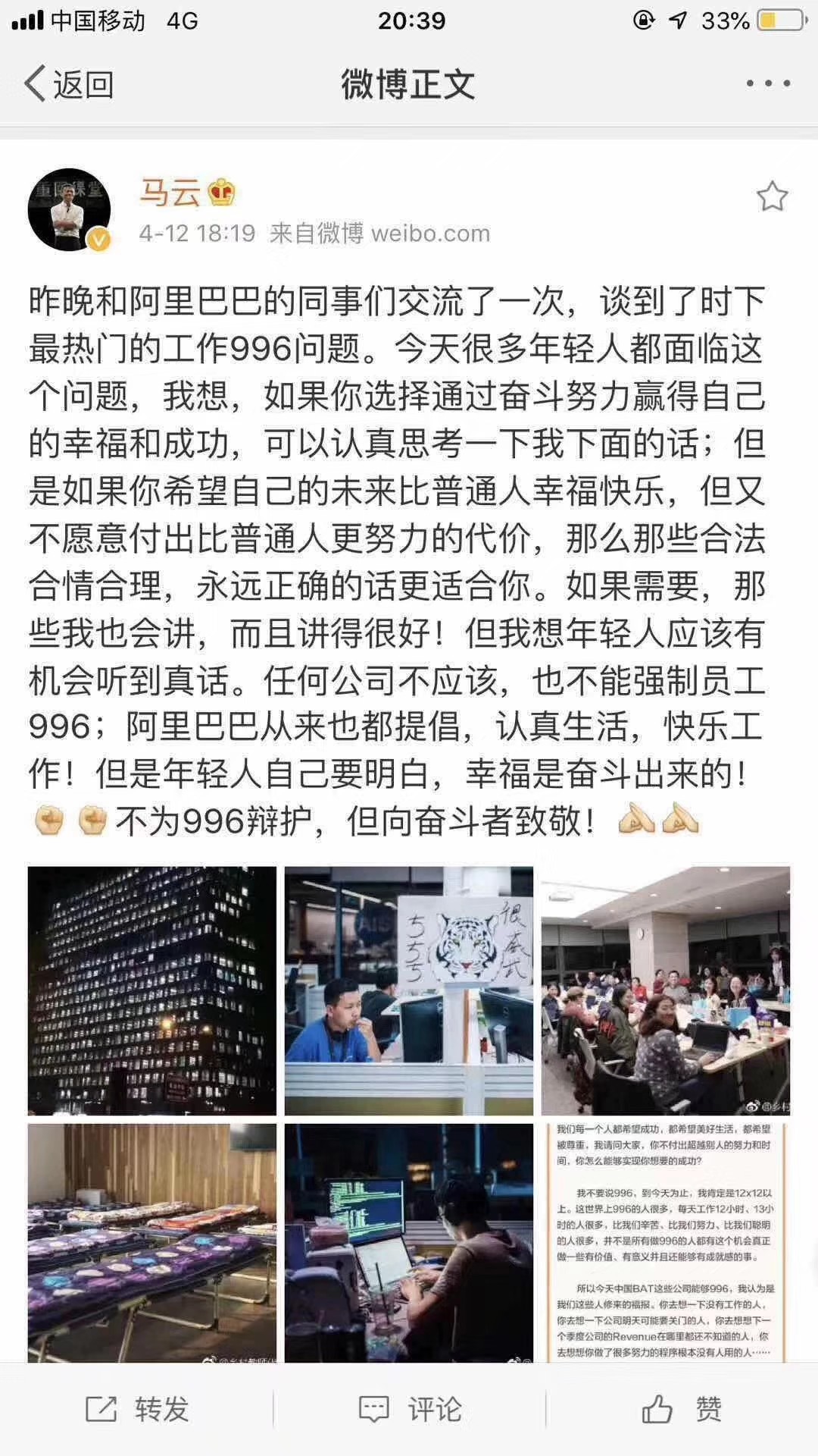 马云微博:昨晚和阿里巴巴的同事们交流了一次,谈到了时下最热门的工作996问题。今天很多年轻人都面临这个问题,我想,如果你选择通过奋斗努力赢得自己的幸福和成功,可以认真思考一下我下面的话;但是如果你希望自己的未来比普通人幸福快乐,但又不愿意付出比普通人更努力的代价,那么那些合法合情合理,永远正确的话更适合你。如果需要,那些我也会讲,而且讲得很好!但我想年轻人应该有机会听到真话。任何公司不应该,也不能马云微博:昨晚和阿里巴巴的同事们交流了一次,谈到了时下最热门的工作996问题。今天很多年轻人都面临这个问题,我想,如果你选择通过奋斗努力赢得自己的幸福和成功,可以认真思考一下我下面的话;但是如果你希望自己的未来比普通人幸福快乐,但又不愿意付出比普通人更努力的代价,那么那些合法合情合理,永远正确的话更适合你。如果需要,那些我也会讲,而且讲得很好!但我想年轻人应该有机会听到真话。任何公司不应该,也不能强制员工996;阿里巴巴从来也都提倡,认真生活,快乐工作!但是年轻人自己要明白,幸福是奋斗出来的!不为996辩护,但向奋斗者致敬!