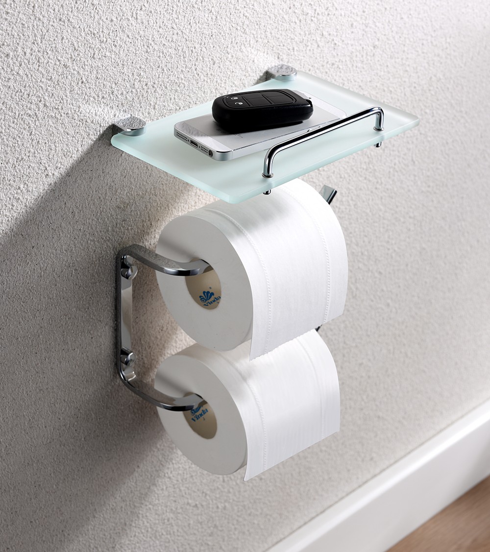 在厕纸架上,加上玻璃平台,还能让厕纸架兼具储物功能。